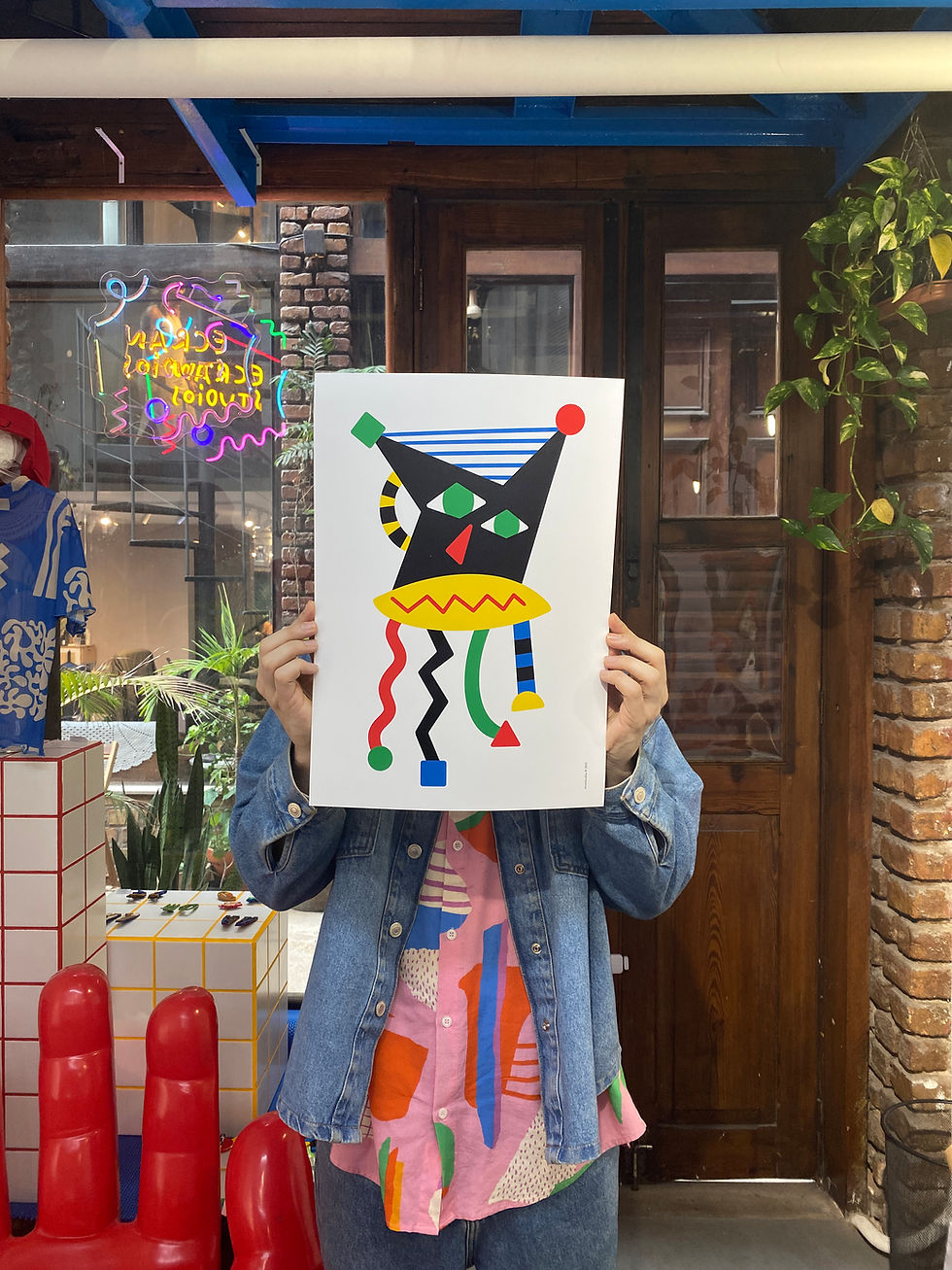 Composição com peças sobrepostas nas cores Rosa, Caramelo, Laranja e Verde e base autocolante.